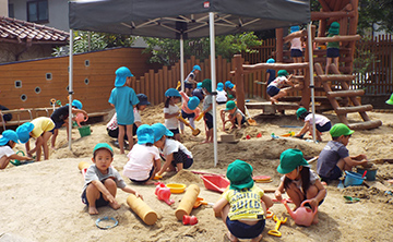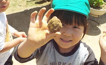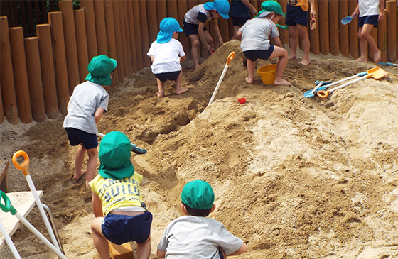 まこと幼稚園の自慢の一つは、大きな砂場です。砂場は、子どもたちが、自分の世界を創造する場所だからです。
