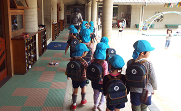 毎朝の登園も、コースを定めて集団で帰宅する降園も、 まこと幼稚園では徒歩通園を行っています。毎日、登園・降園と歩き続ける積み重ねによって体力は飛躍的に向上します。
